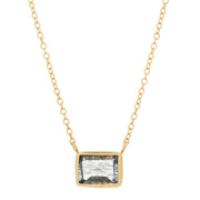 This beautiful emerald cut moss aquamarine necklace is strung on a 14k gold chain and makes the perfect piece for every day wear or layering.