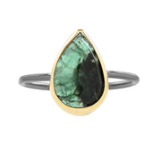 This beautiful 14k gold Brazilian emerald ring features a one-of-a-kind pear shaped emerald in a mixed metal setting.