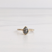 This one-of-a-kind pear shaped salt and pepper diamond is made to wear solo, with a band or stacked with other rings. The diamond is .71 carats and set into 14k gold.